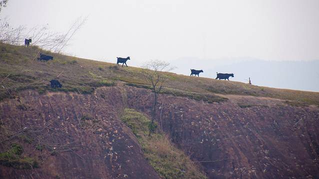 远远见一群黑山羊在光秃秃的山脊上奔跑,两边是直落成百米的悬崖,让人心惊胆战。