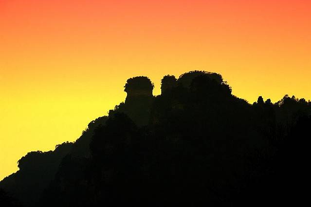 路线二:第一天从武陵源门票站进→游玩十里画廊→坐环保车到水绕四门→游玩一段路程的金鞭溪,(不要完全走完,走到骆驼峰景点即可返回)→坐百龙天梯上袁家界→游玩袁家界→晚上山上(天子山、丁香榕或者袁家界)或者出景区住武陵源。