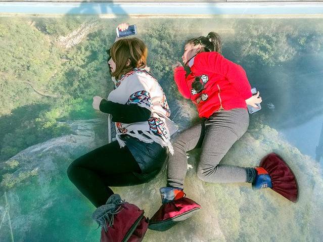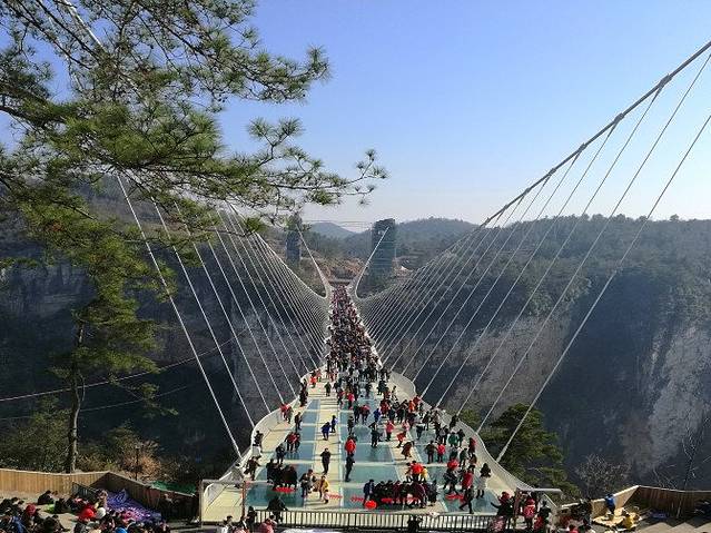 经过了重重检查,长时间的排队检票,终于来到了这神话般的玻璃桥,来之前大宝小宝还在担心不敢走呢,现在看到桥上密密麻麻的人,恐惧瞬间烟消云散了