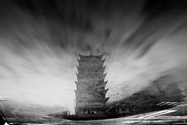 最终在一个广告灯箱上找到了一小片积水,用黑白模式拍下一张比较满意的照片,此刻感觉耳朵一阵疼痛,原来是大宝在揪我,催我快点进景区呢。