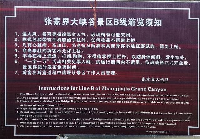 排队乘车时旁边的提示牌明明白白地写着各项规定,本来打算过来航拍玻璃桥的,现在看了计划泡汤了,更重要的是连相机都不能带,事实证明查的很严,安检口3个工作人员会对每一位游客仔细检查。