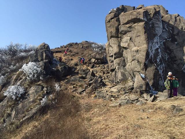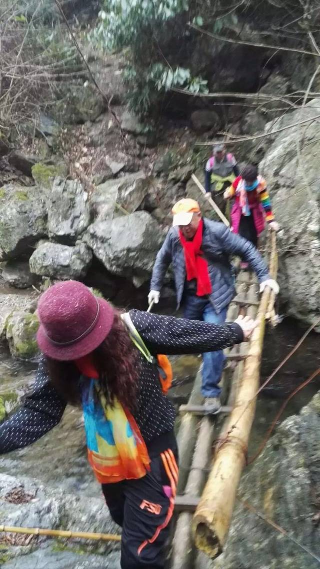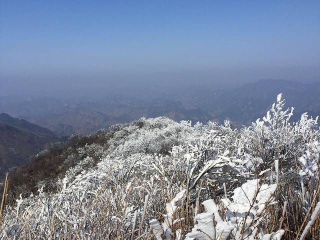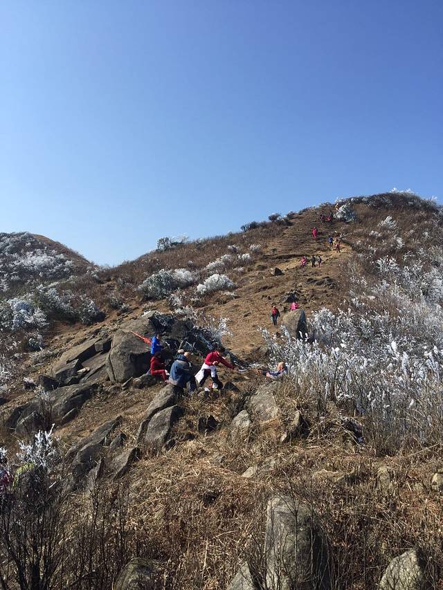 中午十一点我们到达山顶,山顶的景色真是太美了,有雾凇哦,真是不枉此行,太美了到达山顶该拍照的拍照,合影的合影。休息半小时准备下山,栈主在我们休息的时候,他也没闲着,帮我们去探路,谢谢栈主,栈主是一个小伙子,很热情,是一个性格直爽的一个人,做事干脆利落,爬山的时候一直在我们左右 ,注意我们的安全,在这里谢谢栈主咯呵呵。下山很快,我们走了2个小时就到山脚了,这时候大家肚子早已经饿的咕咕叫了,到家就开始吃饭,吃完饭五点钟,栈主晚上帮我们安排了篝火晚会,