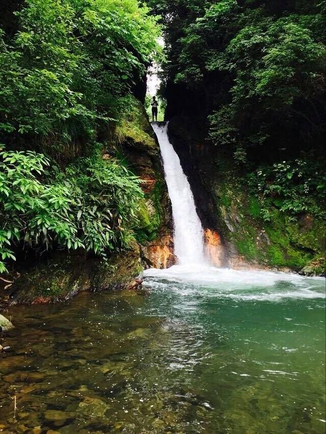 初四早上我们八点出发,【螺丝湾半日游】。螺蛳湾位于龙门坑飞峡瀑布群下游。沿泥土公路往上走。到达螺蛳湾附近。公路是在半山腰上,从公路上俯视下方,绿水绕山,貌似一只趴着的螺蛳。故而此处叫做螺蛳湾。龙门坑飞峡瀑布群,瀑布所处地名而命名的。全程大小瀑布错落。起点为龙门瀑布,瀑布出水出似一道门,故而叫龙门瀑布。石壁头瀑布为整个瀑布群最大的瀑布,其总落差超过20米,分为三段。其中最具观赏性的当然要数彩虹瀑布了,早9点到下午3点那道美丽的彩虹挂在瀑布上,酒下无数亮斑。而三段瀑布之间有个深潭,游玩时,可以从下面攀岩到深潭边观看。喜欢攀岩的朋友可以顺着彩虹瀑布爬上瀑布的上游,观看两座巨石杂夹在中间的小溪,瀑布水源的出去,抬头仰望,两座近百米高的巨石似乎要连起来,蓝蓝的天空变成一条美丽的蓝丝带,此情、此景,实属罕见,正有坐井观天之感触。
