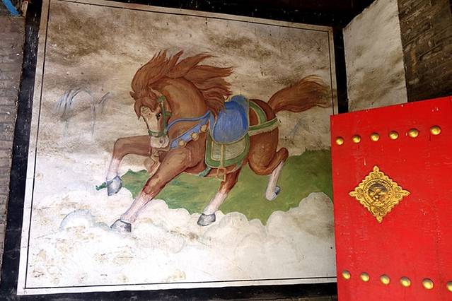 门里一间是马殿,墙壁上绘着赤兔马和白龙马