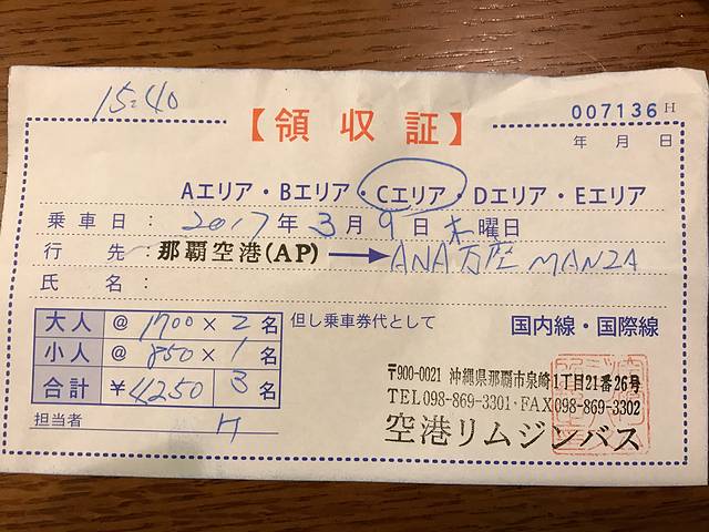 冲绳那霸机场买的机场大巴票两个人加婴儿4250日元,来之前电话过酒店问到机场大巴的信息,只要到那霸机场的国内Terminal, 找到Okinawa Bus,在C区,17:40末班车。我们航班两点到,坐的三点四十的车。时间很充裕