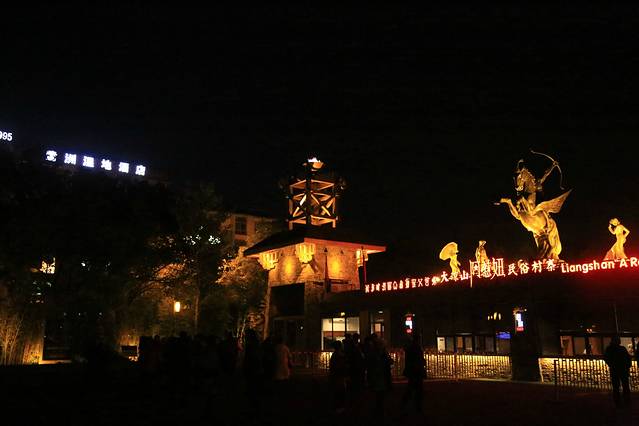 晚上七点过我和豪子来到位于西昌火把广场的阿惹妞民俗村寨,上次就是因为春晚看到了这里才来的西昌。我下午说请豪子看阿惹妞演出,但他却抢在我之前把票买好了,还算他有点良心,嘿嘿嘿。我们购买的是一人120块的票,还有其他位置更好的坐位票价更高一些。售票处旁不远是上次我吃过的一家彝餐餐厅叫阿斯牛牛,味道特别赞。进入村寨,在外场,到处都是熙熙攘攘的游客热闹非凡,彝家的风格融入现代的建筑里面,有种在古今穿梭的穿越感。入场时间是七点半,演出开始是八点,结束是九点(周六)。看了一看时间差不多了,于是就和豪子一起进入内场。内场完全是按彝族传统村寨的模样修建,木结构的房屋,分布在四周的山坡上,四通八达的小山路连接着每户人家,演出主要讲述的是彝族的神话故事,分为序《起源》,上《天之火·生命的图腾》,中《地之火·岁月的沉香》,下《人之火·千年的欢歌》,尾声《祈福》五个篇章。