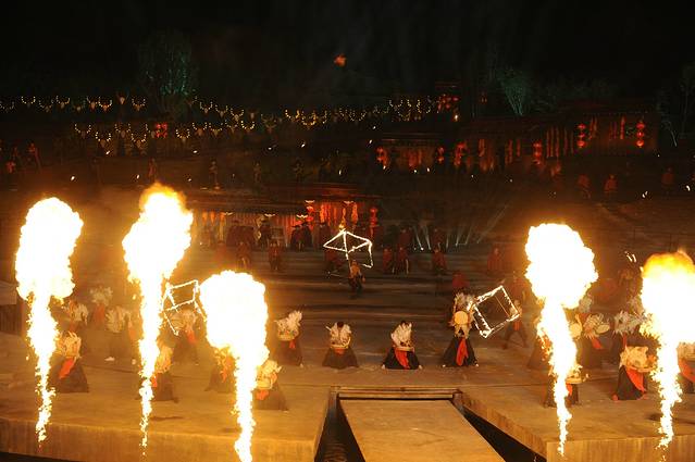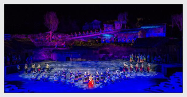演出开始了,没多久就听豪子叫到:“卧槽!”四周也都是各种惊叹的声音。只见黑夜中一只巨大的金色巨鹰沿着寨子环绕一圈后(开始我还以为是凤凰),飞到了舞台中间巨大的水幕上如同悬立在空中。随着古老高亢彝语山歌响起,有一种洪荒的史诗感在我心里弥漫,虽然是第二次看,依旧那么震撼。漆黑的山坡上开始出现点点光芒,如同一双双眼睛,仔细一看是彝族汉子们手举牛头骨站在四周,像是在举行什么仪式。接着又是一阵惊呼,舞台四处开始迸发出红色的火焰,巨大的热量远在观众席上的我们都能完全的感受到。整个村寨如同火红的太阳撕破整片夜空......