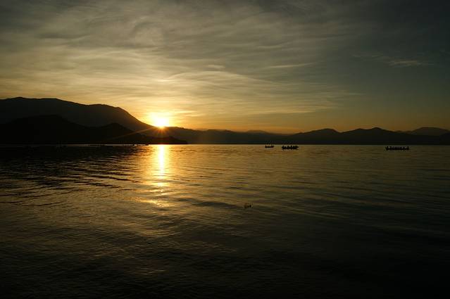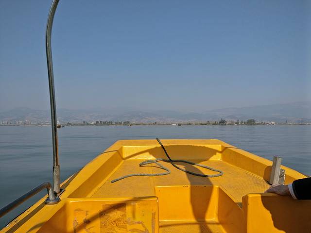 沿着环路兜一圈,有人骑着摩托艇在邛海上兜风羡慕不已,可惜我们没有找到租摩托艇的地方,便只能求次寻找游船。游船有两种,一种是机动船,一种是手摇船。手摇船的乘船地点要往后多走一段路。都是一人是半小时30块。我和豪子一致选择了手摇船。师傅一边摇着船,一边告诉我们邛海对岸还有一个原生态的村落叫小渔村,遗憾的是现在修缮,不让游客进去。我们乘船在邛海上漂着,说不出的舒服。