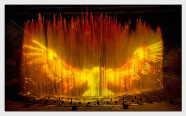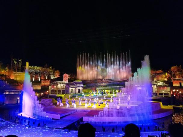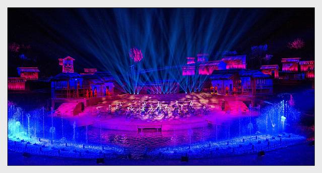 豪子还记着他的阿惹妞,说这都是一群光着膀子的大汉子,贼漂亮的彝族姑娘们在哪呢。我叫他不要急,随着演出的进行,四周的火焰渐渐暗去,不知道什么时候台上的小伙子们已经悄然退场。随着音乐的慢慢柔和,一群身披银装的姑娘们华丽登场,原本喷射火焰的地方开始喷出水幕,在灯光的照耀下色彩斑斓。我转头看了看旁边的豪子,浑然一幅全神贯注的模样,果然还是姑娘对他有杀伤力......