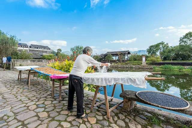 听说这里是以“文房四宝”为意象而构建的,峰如笔架,鹅卵石小径为笔,路旁巨石为墨,地面和墙壁是纸,村中池塘则是砚台,这一切就像是刚预备好的山水画,画了千年,美了千年,一直保留着当年的纯粹意境。