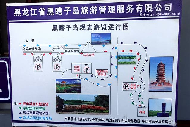 我们的参观路线是:游客中心——乌苏大桥——东极宝塔——中俄交接遗址259号界碑——湿地公园——俄罗斯兵营旧址——游客中心