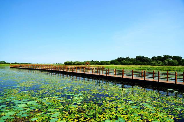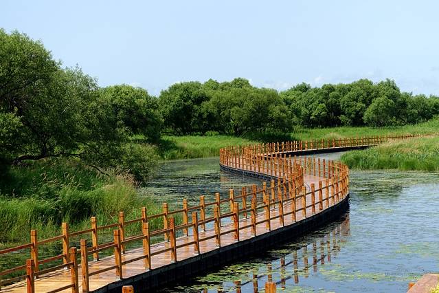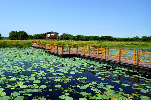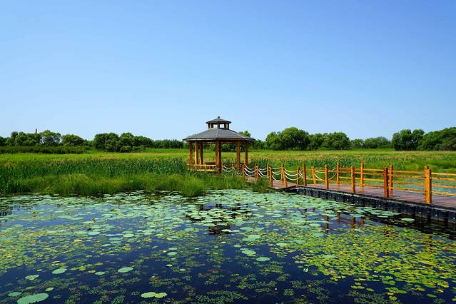 湿地中有一高7米的木质观景平台,是公园标志性建筑,可登高一览全部湿地景观