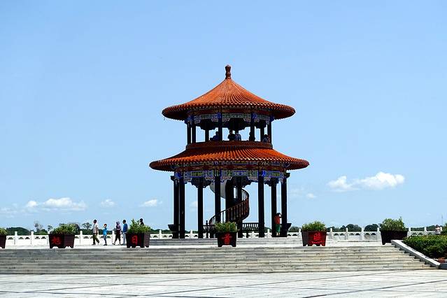 太阳广场上的太阳亭,当地人也叫观江亭。游客可在这里观看中国第一缕曙光,这里夏至(6月21日或6月22日)时的日出时间为北京时间2点15分。