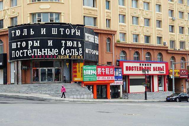 由于是边境口岸城市,抚远商业区店铺的标牌,也都是中俄双语的。
