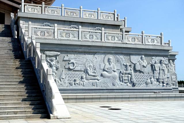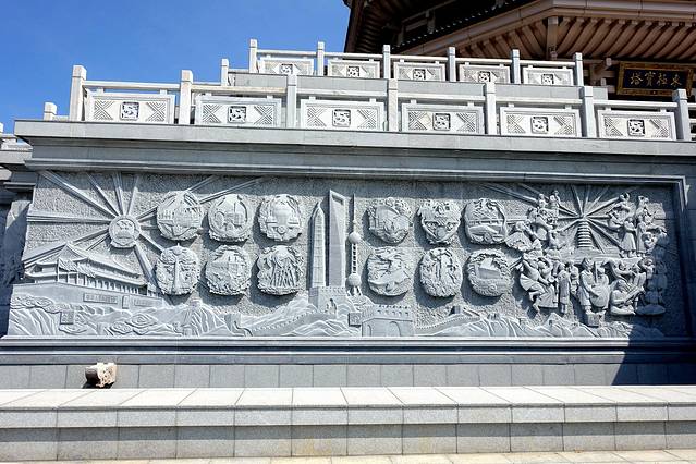 广场布设60根青石盘龙浮雕柱,周边的56根代表中华56个民族,另有4根擎天精雕龙柱设置在塔基四角