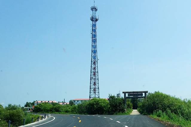 左侧大路是通往东极广场的公路,直行进入乌苏镇。乌苏镇里的中国移动通讯公司的----东方第一通讯塔(基站)。