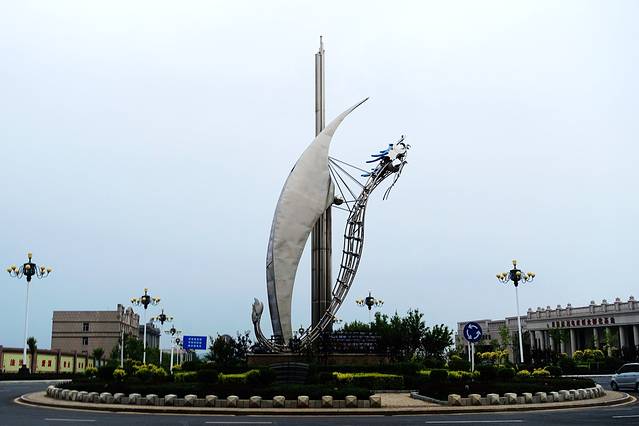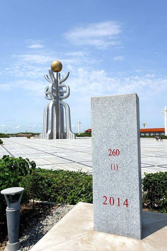 东极极标雕塑,极标高49米,以古篆体的“东”字与象征太阳的金色球体组成。无论从哪个方向望去,都是一个特大的“东”字托举着太阳的艺术形象。极标下是巨大的大理石中国地图。