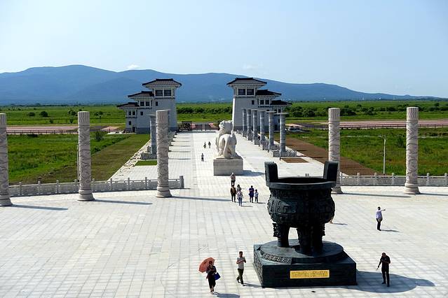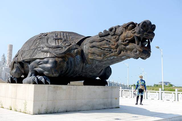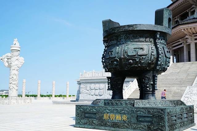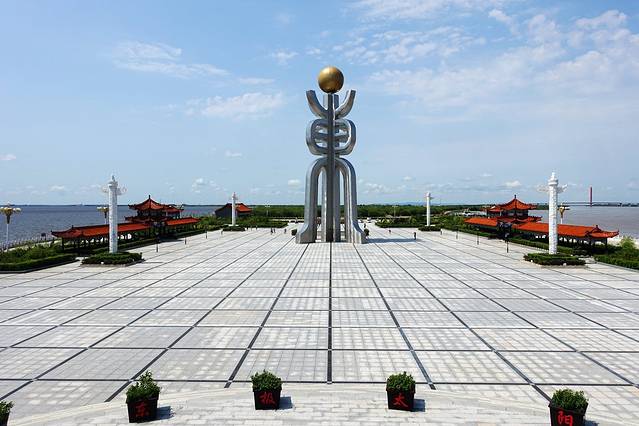 广场为太极图案,直径171米,代表黑瞎子岛回归的171平方公里领土,太极图案的两个极点分别布设龟和麒麟。主广场为两层错台,高4米,广场侧墙环绕以护城河意象的水池,外部再围以环形道路,并在东西南北四个方向拓宽设置巨大的鼎雕塑和擎天精雕龙柱。