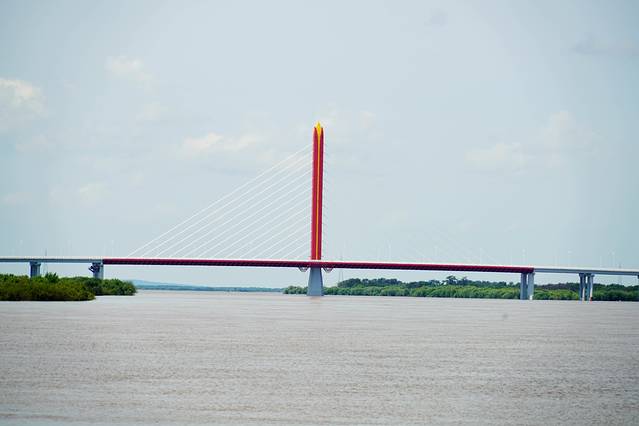 远眺上黑瞎子岛的乌苏大桥。大桥主塔及主桥钢梁颜色为富有中国特色的“中国红”,是世界上首座大挑臂钢箱结合梁斜拉桥。