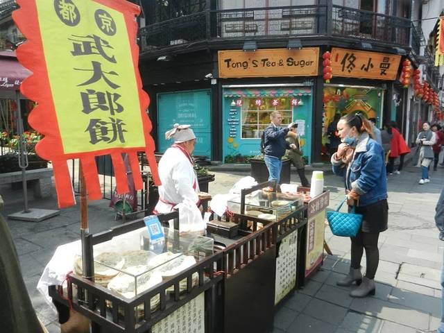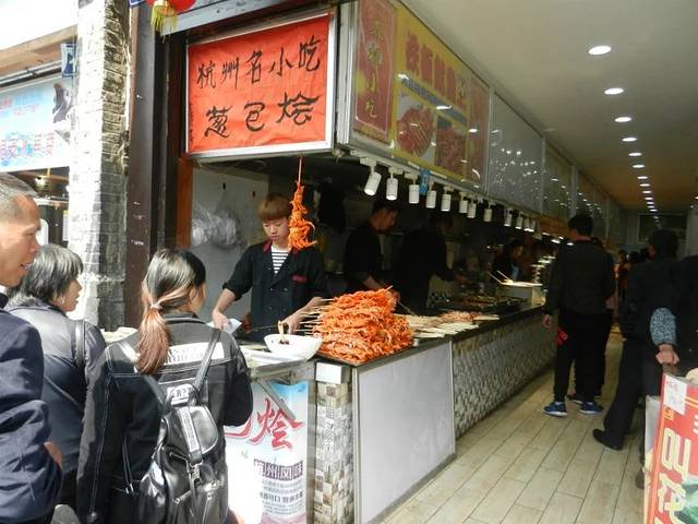 从浙江大学玉泉校区门口做16路公交换乘25路,终点站就是吴山广场,朝着人多方向走就是河坊美食街了,在这我又一次体会到全国小吃街都是一个流水线,基本都差不多,纪念品也是每个城市都可以买到的,我们也没买什么纪念品,如果有想买纪念品回去送人的,我看到有许多店铺卖那个杭州七宝,还有藕粉,听说买来送人还是不错,可以自行选购,街上有卖状元饼和葱包烩的,这两种是杭州很有名的小吃,我们没有多余时间去追寻城市中那些最原始的味道,只能来美食街上体会下了,我微博上看过一个视频,讲述的是一位位老奶奶已经年过六旬还坚持每天经营她的葱包烩小摊儿,很是感动,如果有时间,你们可以深入杭州的大街小巷,寻找只有当地人才买单的纯粹味道