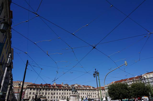 菲盖拉广场上星罗棋布的有轨电车缆线。四周整齐方正的18世纪建筑,是1755年大地震之后,庞贝尔侯爵主持下重新规划建起的。