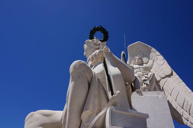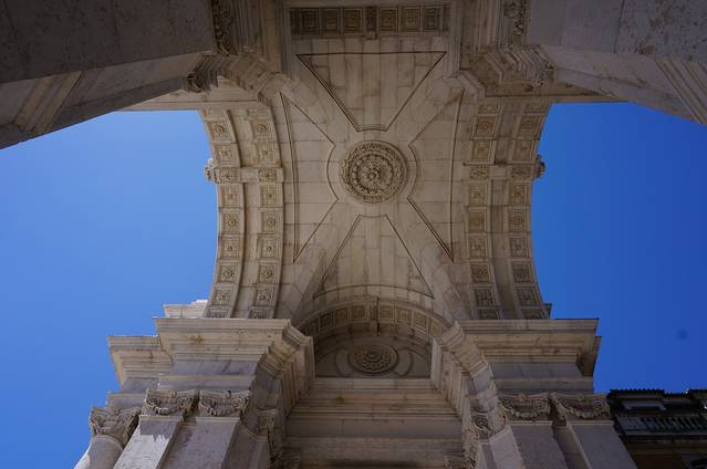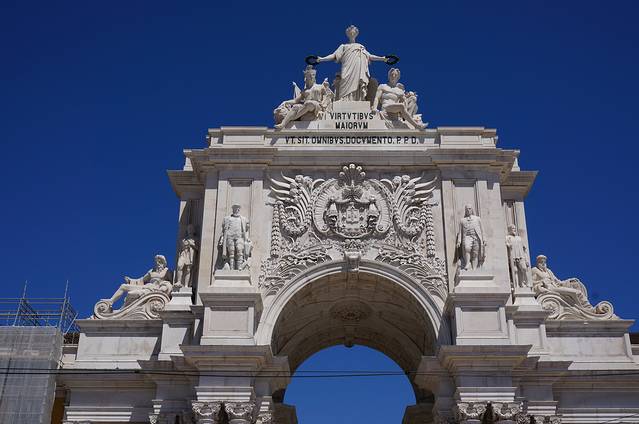 奥古斯塔凯旋门,柱顶有四尊雕像,右侧的两尊代表努诺·阿尔瓦雷斯·佩雷拉和庞巴尔侯爵,左侧的达·伽马和韦里亚托。两个斜卧的人物象征特茹河和杜罗河。上面的葡萄牙文意为“荣耀为天赋和勇气加冕”。