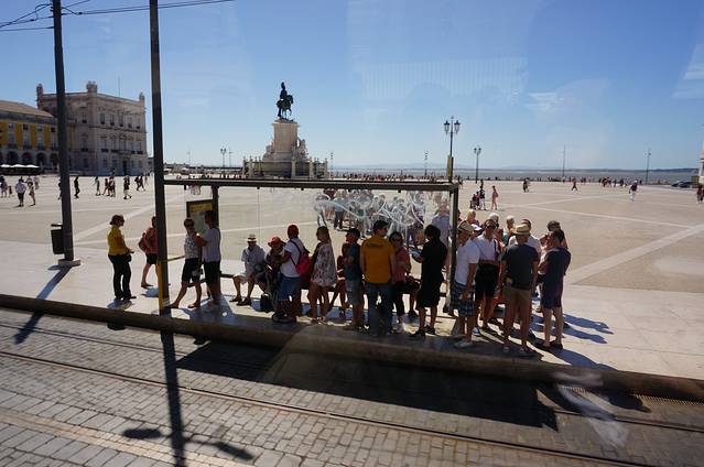 里斯本商业广场炎热的日晒下排队等观光车的游客,尽管人多非常有秩序。
