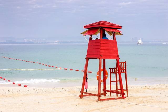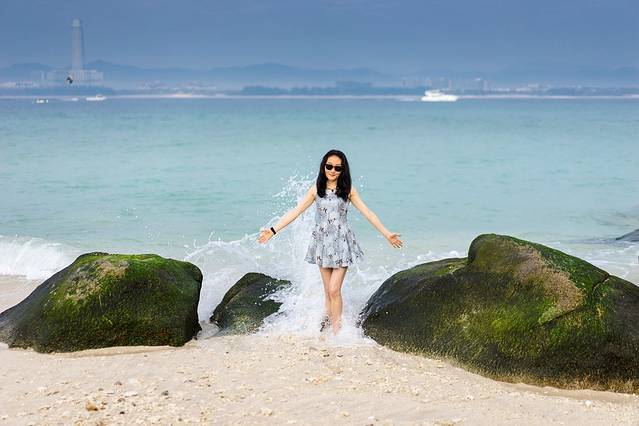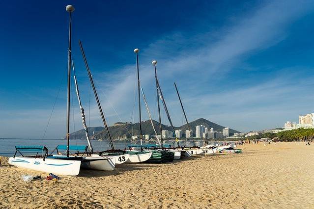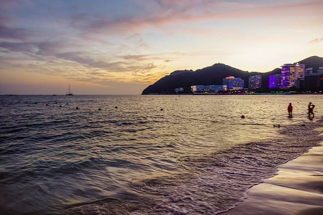 2. 大东海:市区的海滩,地理位置很不错,海滩沙子和海水都算是可以的,周边生活条件很好,吃的、购物的都非常多,很多一日游也是来这里的夏日百货接人的。酒店档次高中低都有,很多价格低的小客栈都是用旁边的小区房来改建的,比如金茂海景小区,但条件其实还是可以的。住在这里我觉得是穷游的首选吧。