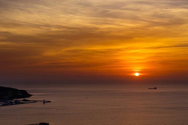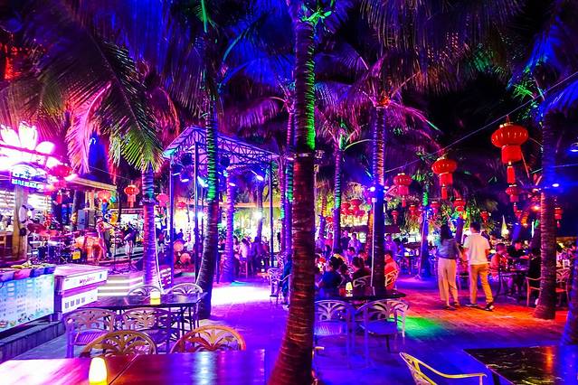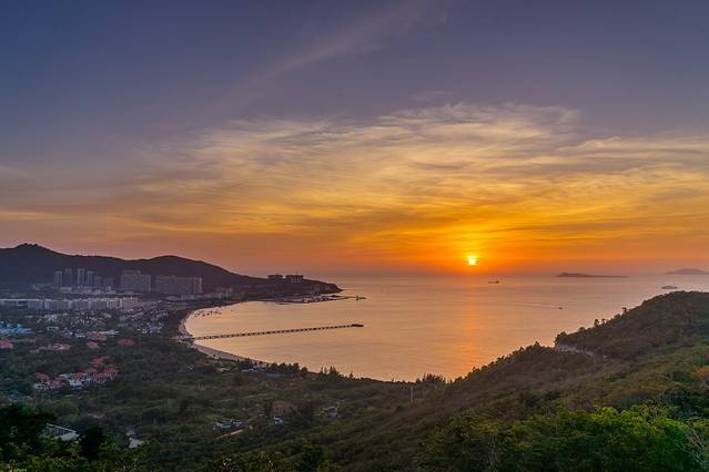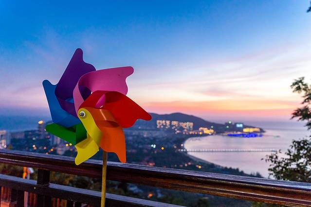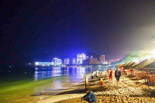 待得一餐饱睡后,发现竟然已经日落西山,黄昏的海正是一天中最漂亮的时刻,只可惜这最美时刻十分短暂。当夜幕降临时,貌似大东海的海边却暴发了活力,各种灯光、音乐响起,人流竟然不输白天。