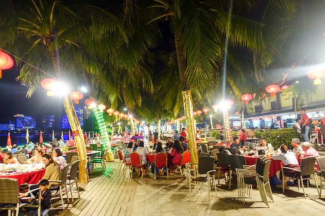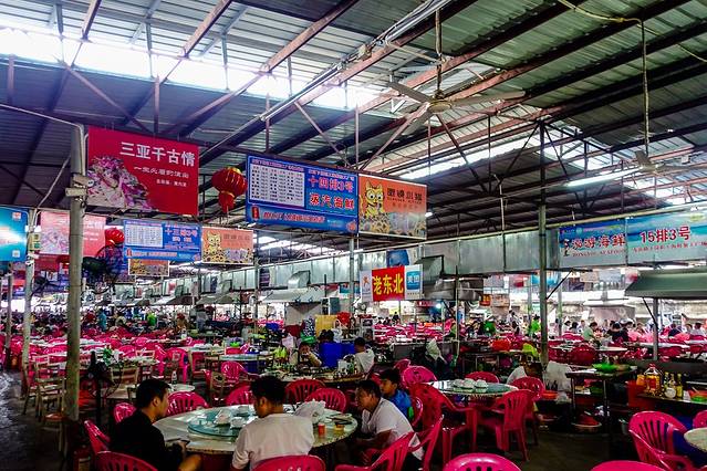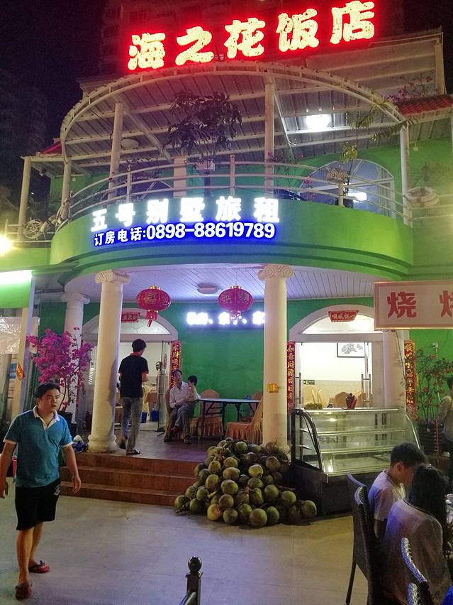 这个就在三亚湾旁边,但我真的不推荐,真心坑的,首先海鲜的摊位很少,没几家,所以海鲜可选的也不多,价格并不便宜,关键是会坑你的,我们去他一称,就丢给我说3斤,我说你再称呀,他还不情愿,然后一称,还是说三斤,还说你看这里显示3斤的,我过去仔细一看,那显示的钱数呀,欺负我看不懂电子称吗。然后买个虾,装了袋子一堆的水,我让他倒水出来也不愿意。我买海鲜想挑一下,他说这里买海鲜不能挑的,个个象你这样挑我怎么卖。好吧,我在大排档吃饭还能挑,你这里怎么就不能挑了。