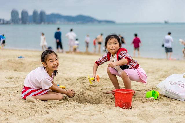 小朋友自然闲不下来,还好这时已经开始热闹起来,小家伙很容易就找到了自己的玩伴,一起相约去挖沙子,踩海水,一样的其乐无穷。