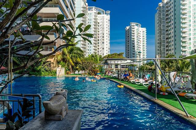 金茂小区里有停车场,过夜是10元一天,如果是这里住,你进出几次的话,说明一下,也是只收10元的。春节旺季有时候小区停车场位置不够,我们停在小区附近路边,也是不收费的,不过要注意停在划线的区域内。小区的三楼有一个空中花园,还有一个游泳池,虽然要另外收费(大人20,小孩10元),但也不错呀,因为其实在海边顶多就是泡下海水,要游泳还是比较难的,浪比较大嘛,特别是小孩,能在游泳池里游泳是非常开心的事。
