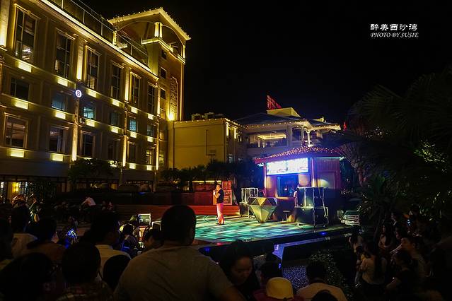 “酒”足饭饱,在酒店里闲逛,露天吧台有些艺人在演出,