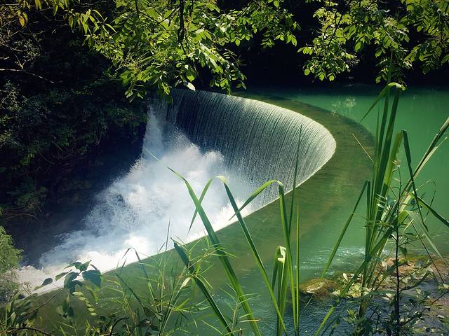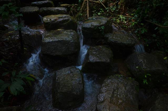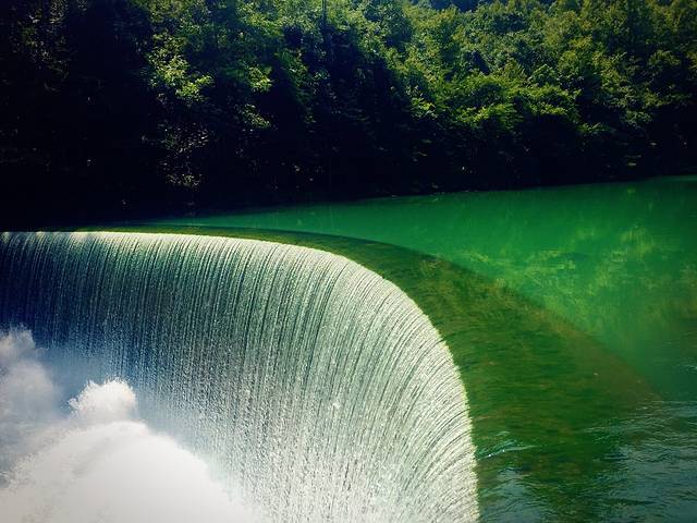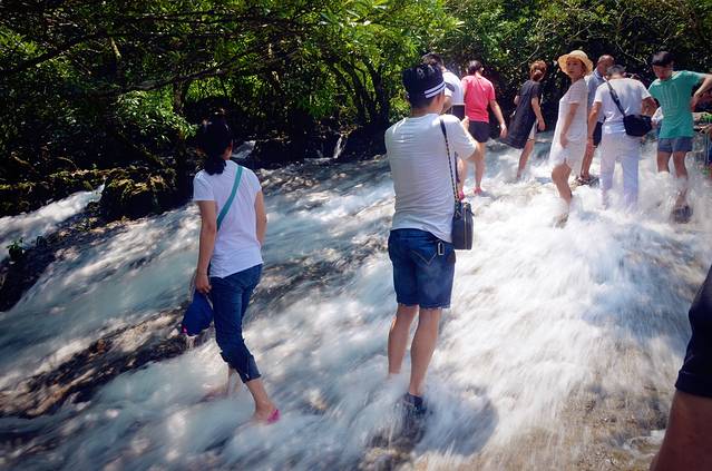 领略过观景台,我们来到了青龙涧,青龙涧是由若干个顺流而下的小瀑布组成。由于是地下河从山里流出地表,水的颜色是碧绿色,捧一捧在手里,极为清澈。而且,你在瀑布边行走,很容易感受到水的清凉,温度比其他地方要低上4-5度。