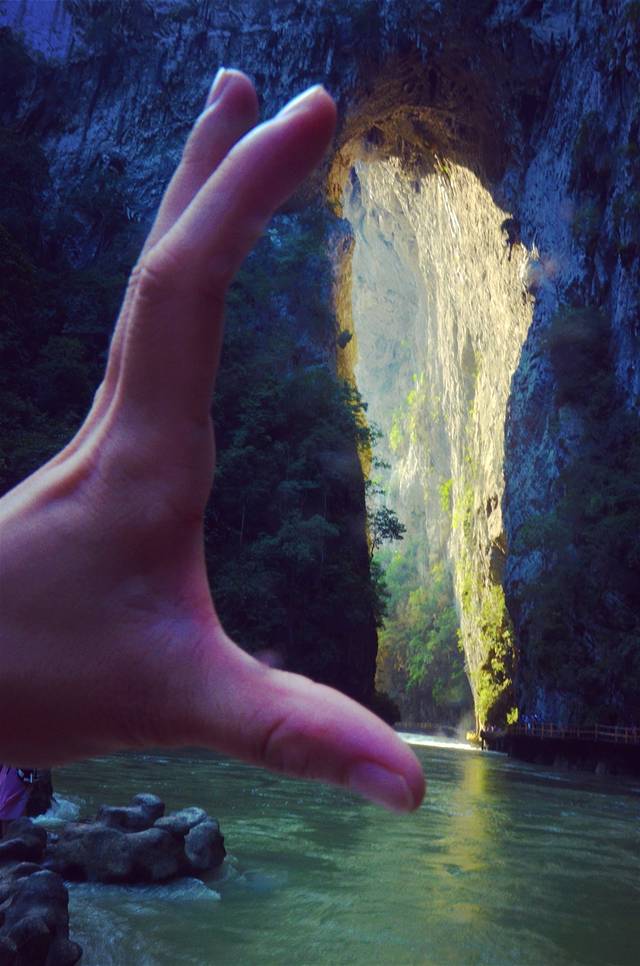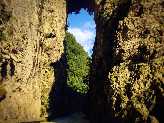 天生桥真的很壮观,早先水位是从上面的门楣流过的,后来经过地壳运动,山体提升,变成了现在的样子。当地人就是借着这座“桥”,往返于两山之间。