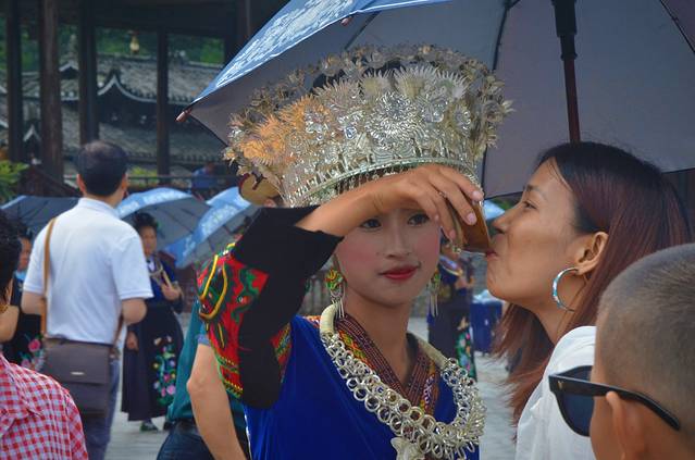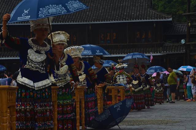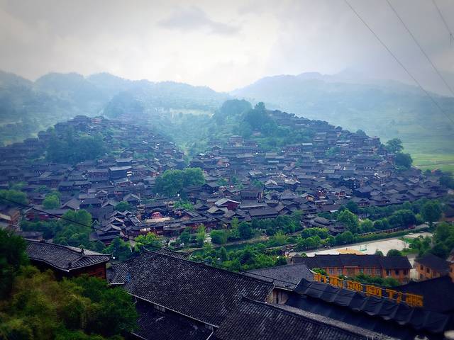 从小七孔开车到千户苗寨大约4个小时不到,一路高速。车辆不能进景区,要停在停车场,然后坐摆渡车进景区大门,再换乘一次到观景台。比较麻烦。千户苗寨应该是我们此行中人最多的一站,也是商业氛围最浓的一站,因此第一印象就打了折扣。