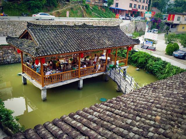 当晚入住云水阁客栈,这家客栈还是茂兰的小周老板推荐的,客栈老板很帅气,服务也很好,价格很公道。客栈门口有一池塘,在池塘中建了个饭店曰“趣食鱼餐馆”。客栈里小七孔景区也就200米吧。