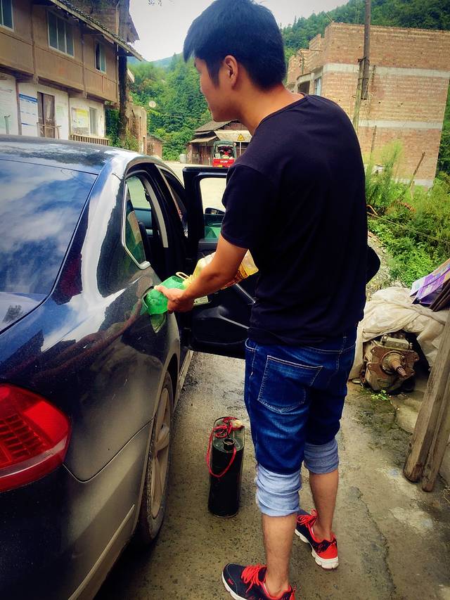 由于司机忘了加油,结果我们跑到油箱几乎没有了,离终点还有19公里。我们开到一个叫加么村的地方,一家一家的问有没有散装汽油卖,结果还真找到一家。花了100元,加了差不多10升油。后来才发现,其实在这种山沟里,当地村民出门经常会带几个油桶到加油站加油带回来以备不时之需的。