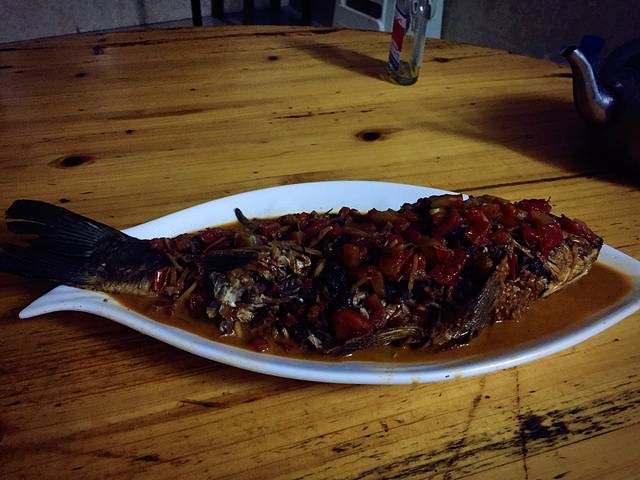 小周一家人都很勤快,只看到他们不停地在为客人忙碌着,这条鱼是他们从自家田里逮的。