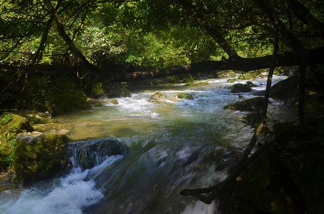 看完拉滩瀑布,我们又坐车回到景区门口,沿景区门口顺流而上,终点既是拉滩瀑布。说实话,这一小段,哪里是螃蟹沟,那里是水中林我不知道,不过景色很美,有点小九寨沟的赶脚。