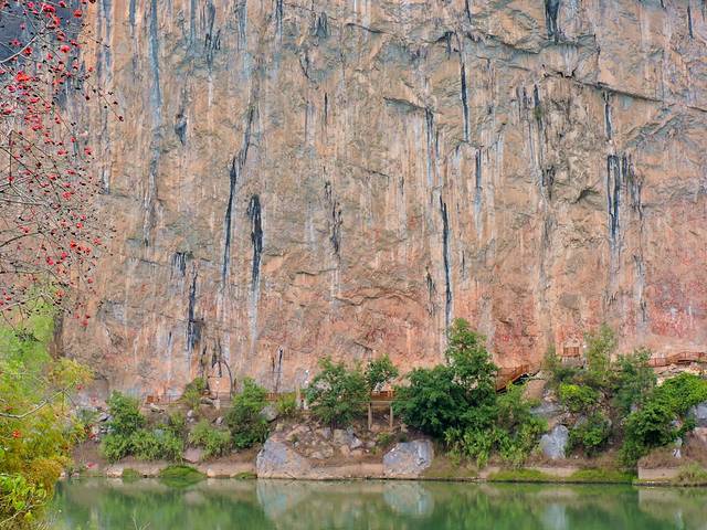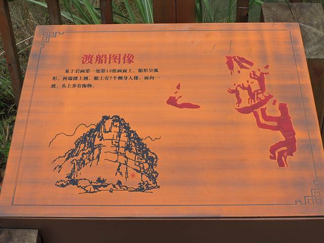 观景台已经建成了沿江的木制栈道,可以观赏江对岸峭壁上的岩画。虽然江对面岩画下也修建了栈道,但是无人上去。据说是武隆保护岩画已经禁止人到岩画下面了。我们在观赏岩画时,还看2、3艘游船在江中巡游到岩画下停留片刻即离去。有一块大石头上刻的碑文介绍了花山岩画的来历和内容