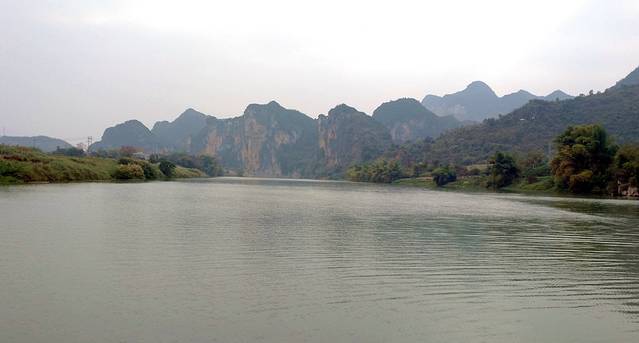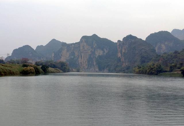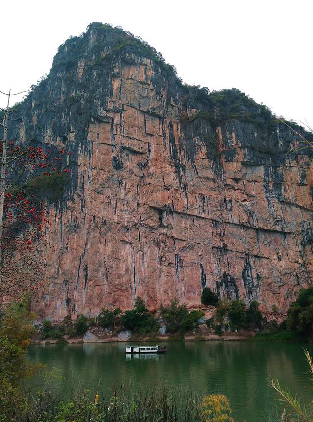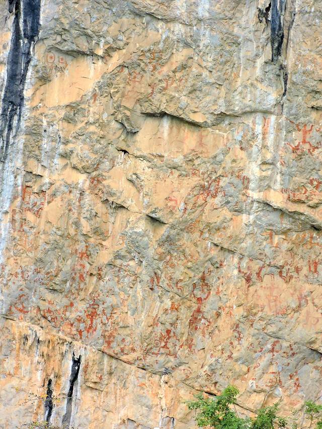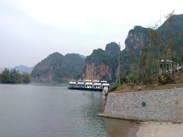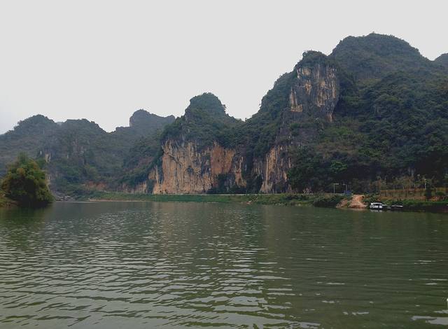 看了一下里程表,从渡口到岜耀观景台有11公里。下面是渡口和在渡轮上拍的景色。渡口边的山崖上据当地人说也有岩画,但已经模糊不清且变色,用望远镜看也是似有似无。