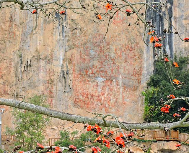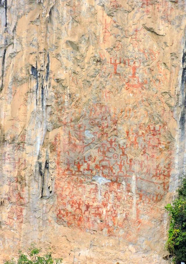 左江花山岩画在广西崇左地区宁明县境内。左江两岸高耸、陡峭的岩壁上,公元前五世纪至公元二世纪,当地先民——左江骆越人绘制了大量的岩画。这些岩画反映了骆越人精神世界和社会发展面貌,展现了舞蹈、祭祀、生产、生活等场景,具有很高的历史和艺术价值。特别是部分岩画经二千多年岁月沧桑,仍然清晰,色彩鲜明,真是令人叹为观止!
