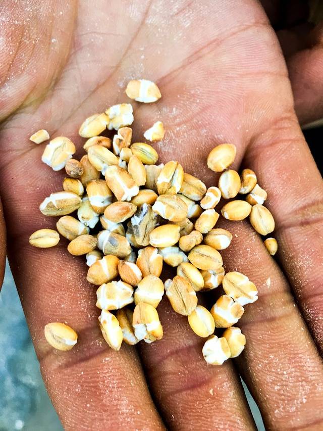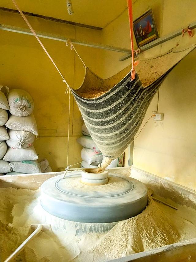 遇到一家现磨青稞面的店,我们想买一斤这样的炒青稞,直接吃真的好吃。店主生意太忙,没空理我们。我们看着他们做用青稞做糌粑新奇,藏族同胞看着我们很好奇。
