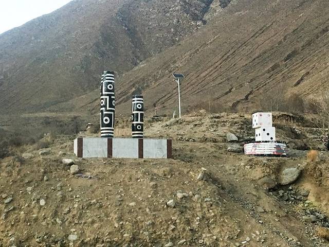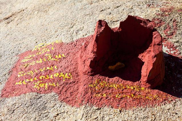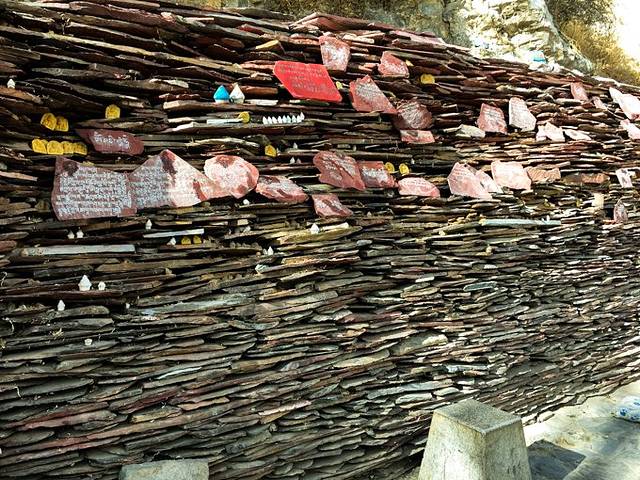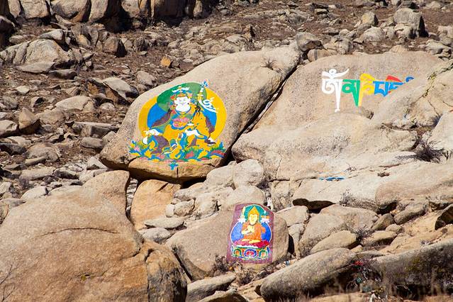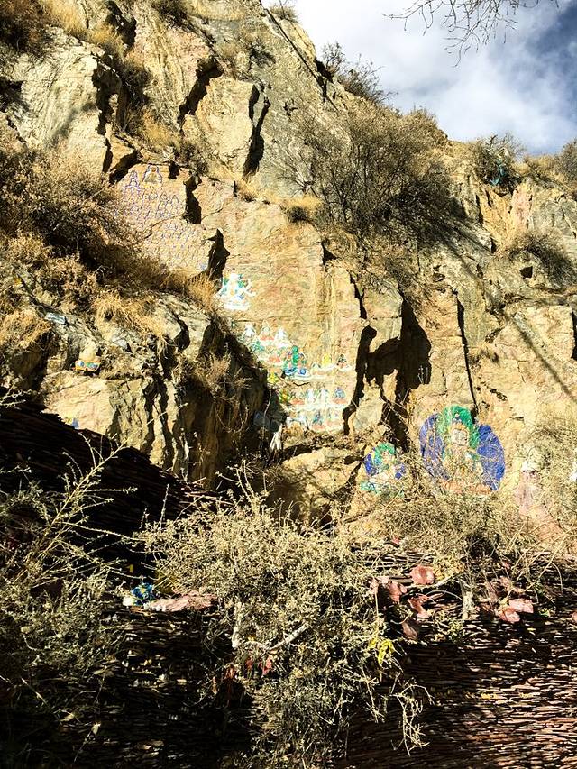 路旁遍布了各式的摩崖石刻造像和六字真言“唵嘛呢叭咪吽,唵(ong)嘛(ma)呢(ni)叭(bei)咪(mei)吽(hòng)”(六字真言藏文的意思是“礼敬莲中宝”)。