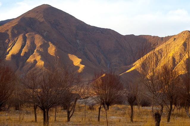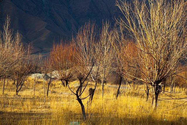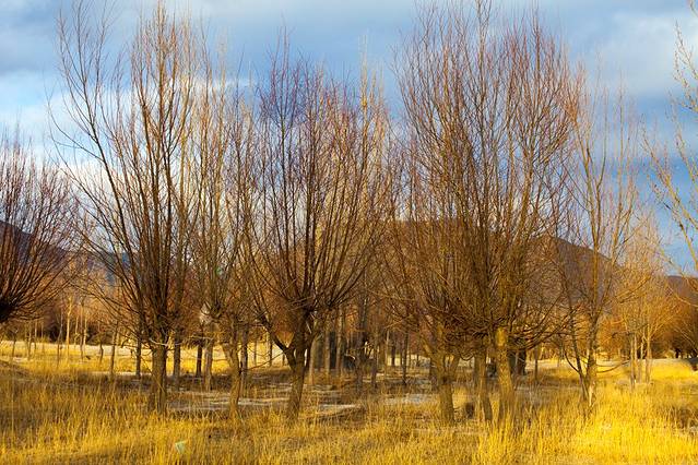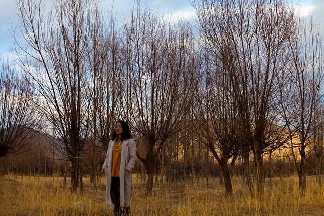 在一个小村子里停下,去厕所,看到后面一边小树林在夕阳下,美得不像话。和一个同伴儿去装文艺范儿。