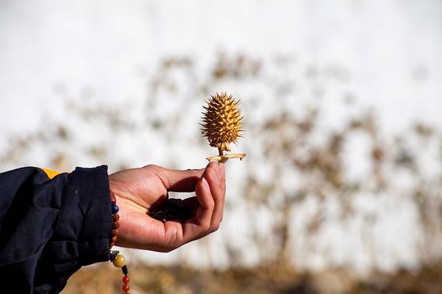 在院墙外见到很多人在采这个果实,问藏人他们也不知道是什么,但说开花很美,采了一颗,把里面的种子倒出来,同伴说拿回家种种看。回来问了一个被称为植物专家的朋友,才知原来是曼陀罗的种子。原来在云南大理路边有见过黄色的曼陀罗花,听说全身有毒不敢靠近,朋友说,广东可以种,东部华侨城茶溪谷有,很漂亮,只要不吃就不会中毒,它也是一种药材,这下放心了。