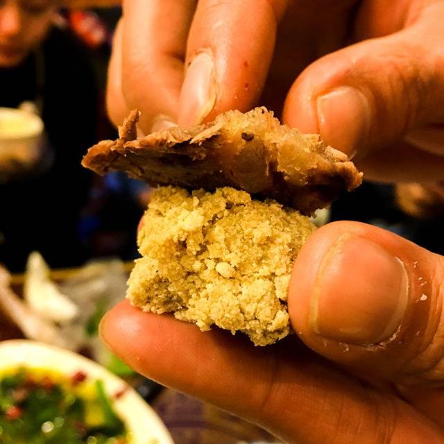 同行一个伙伴正好带了一个藏族朋友,请教示范给我们看藏族的糌粑应该怎么吃。正确吃法是把牦牛肉切成小块,和糌粑一起吃。都说汉人吃不惯糌粑,但是我觉得还好啊。