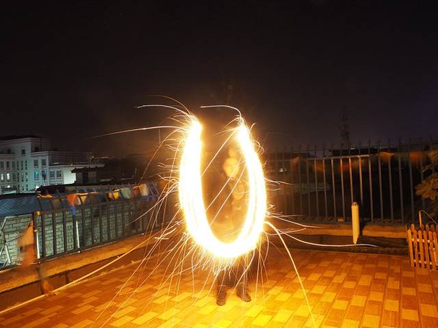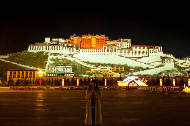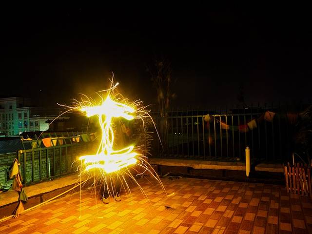 晚上,好不容易才买到仙女棒,而且超级贵。带到布达拉宫广场,先拍了一段新年祝福视频,给每个人录了几秒钟的拜年视频。咨询了广场上的值班战士,烟花是不能在广场上任意放的。在广场上拍光绘的计划就此放弃。恰好布宫的灯也关了,一行人带着仙女棒回到客栈楼顶,终于完成了光绘策划,赶在2017年零点前发出了朋友圈,带着无比愉悦的心情迎接2017年。