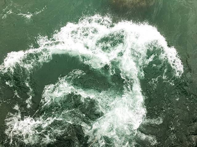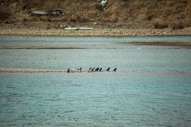 乘公交车来到拉萨河,河水一边波澜不惊,一边波涛汹涌。天气阴,河面蓝绿相间,有水鸟停留嬉戏。